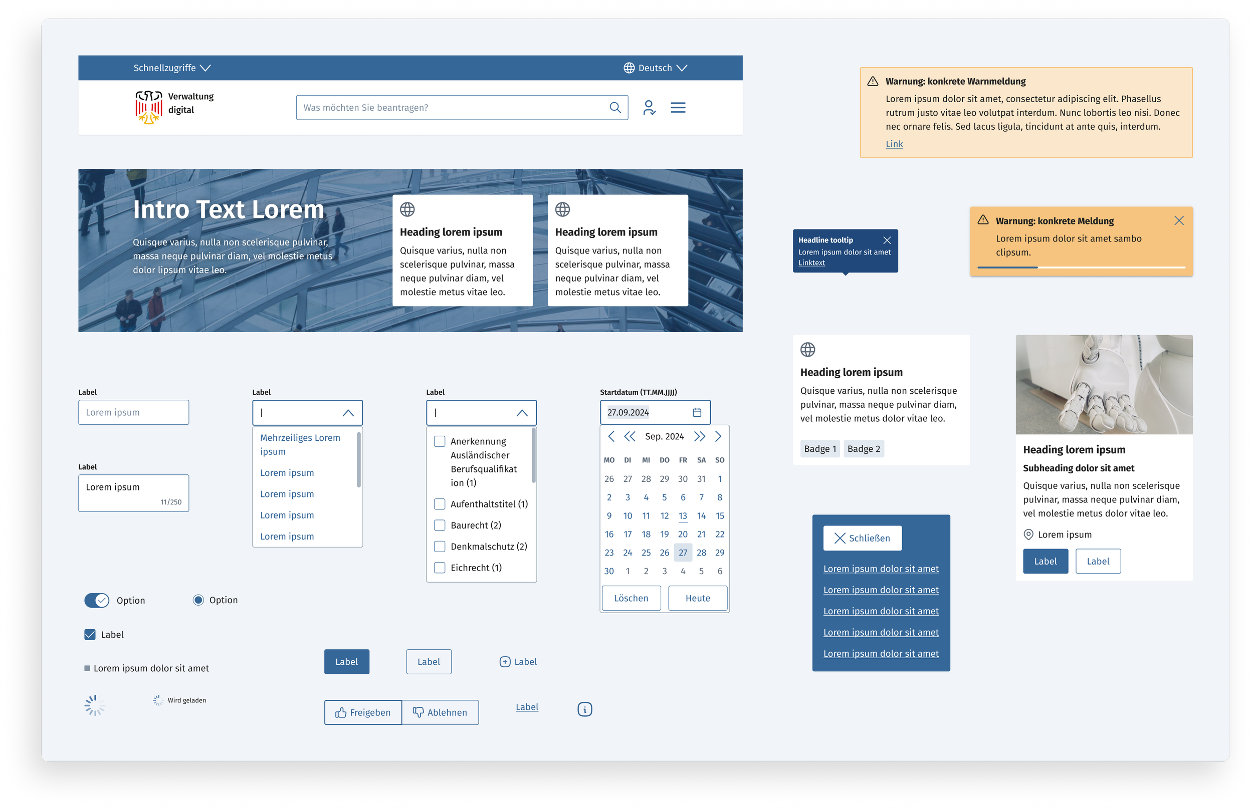 MUSE is a design system built internally for the Bundesdruckerei (bdr) to cover a variety of their digital projects and products. The starting point was the Bundesportal, an online portal to digitize government services and make them accessible to every citizen through a web browser. MUSE grew from there into a fully themeable and flexible system. Its focus is on government websites and portals - we provide an extensive set of form elements for example, and the required accessibility standards are built into our components from the get-go.