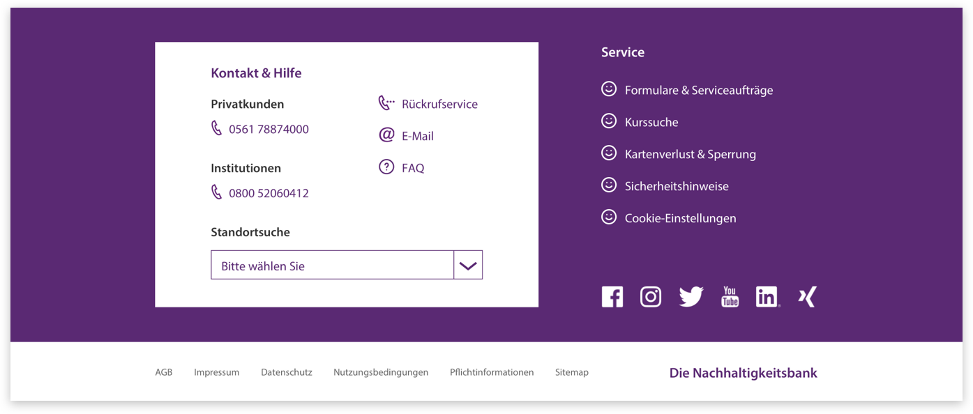 Finally, the footer was tricky because it needed to display ways of contacting Evangelische Bank for both private clients and institutions. After removing some clutter and moving some great content from the footer to more appropriate regions of the website, we arrived at a simpler and cleaner design that will be more comfortable to navigate for all users.