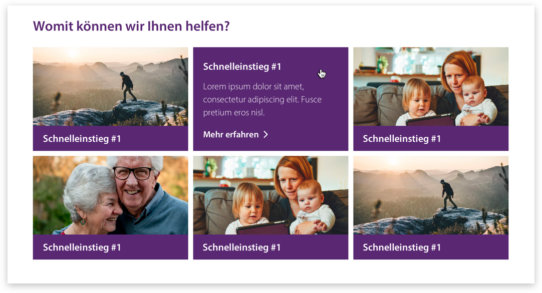 I adjusted the transparency of the overlay on hover on the cards so as to make the white text more readable. The square format also had to go in order to fit all cards into one view of the screen if possible. The cards were designed to be fully clickable, in contrast to the button on the old cards, which moved up and down with hover and was hard to actually catch. This section will, in the future, contain links to pages that are interesting to institutions as well as private clients of the bank.