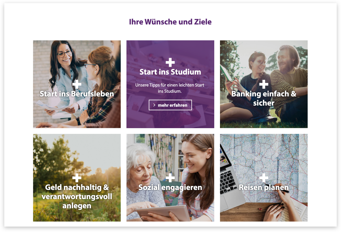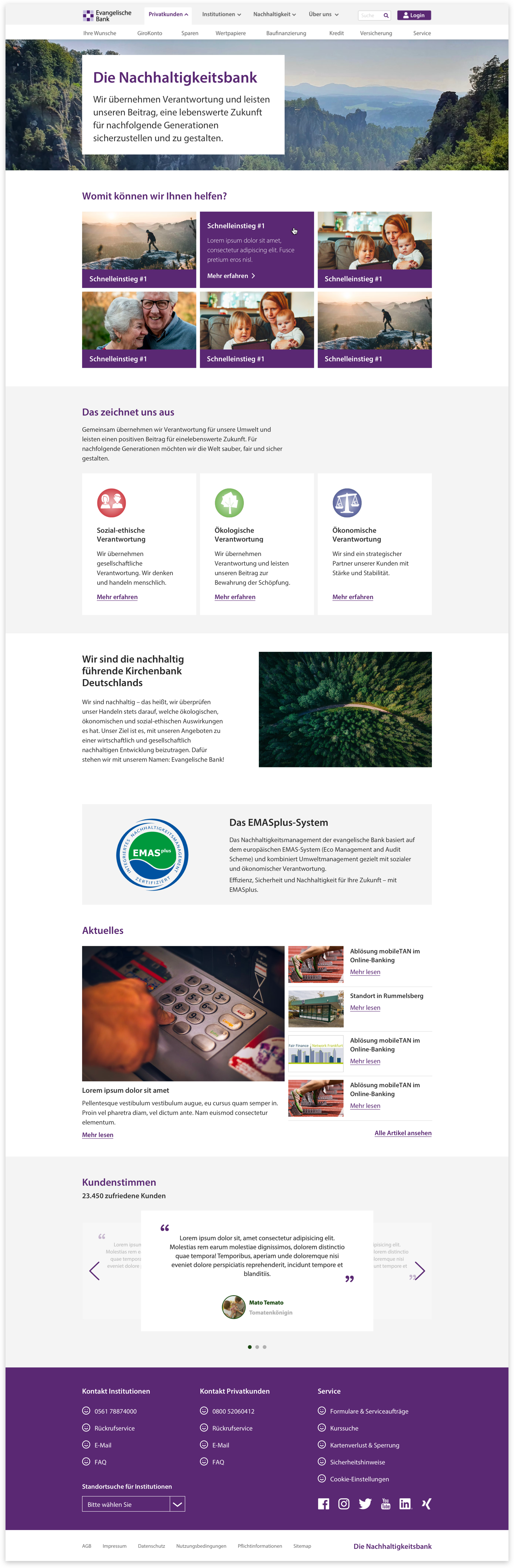 Evangelische Bank had recently restructured their website navigation to put a stronger focus on their institutional clients rather than private customers. Until then, their homepage was addressing private clients only and contained content tailored to them. They asked us to come up with new elements for the homepage that would work for both target groups but keep with the style and functionality of the website as it was. I consulted with the client on what types of content would work, then wireframed, designed and iterated on a restructured page.