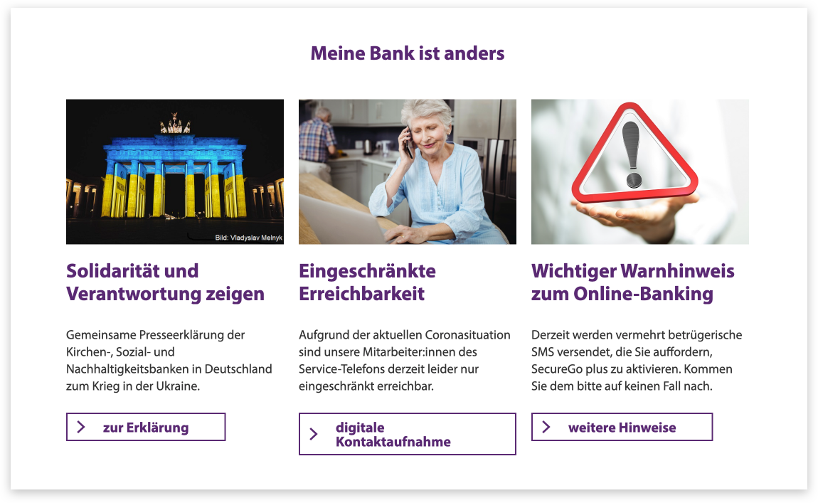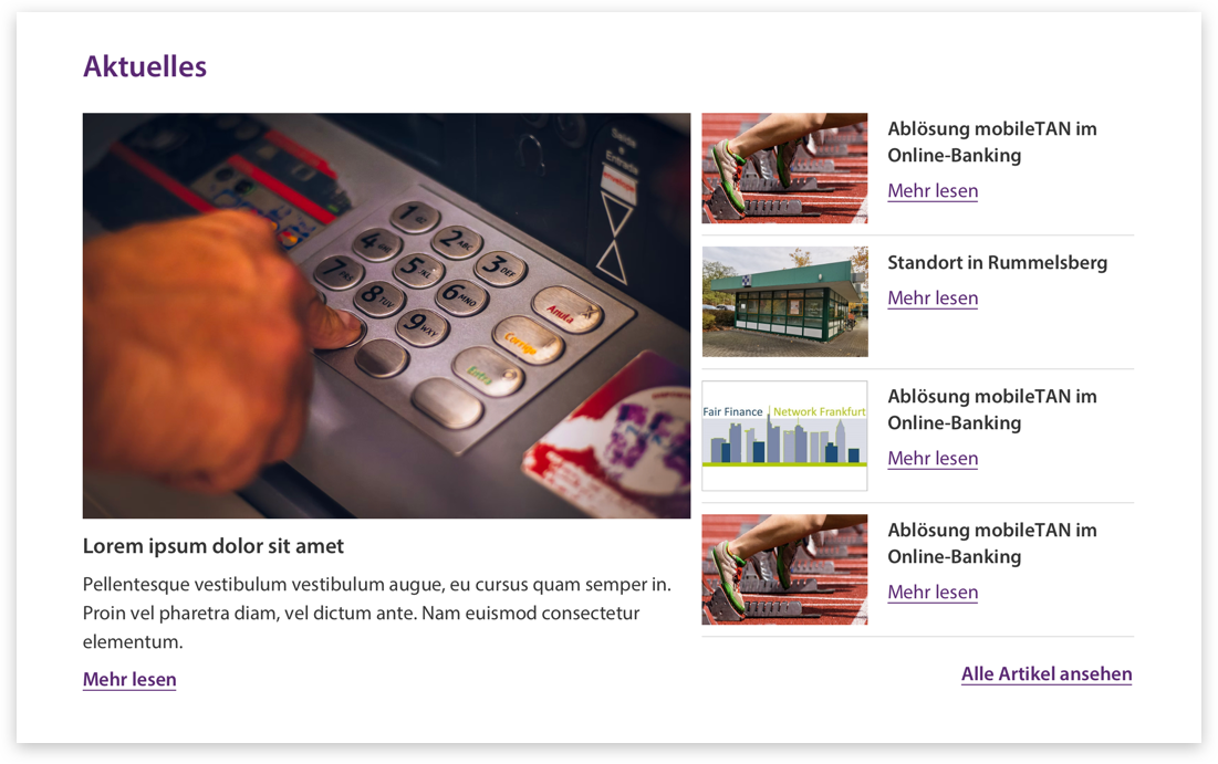I overhauled the news section, adding the option to jump to the news page and highlighting one news item. This provides the option to pull the user’s focus toward an item that can be curated to be important for either target group of Evangelische Bank.
