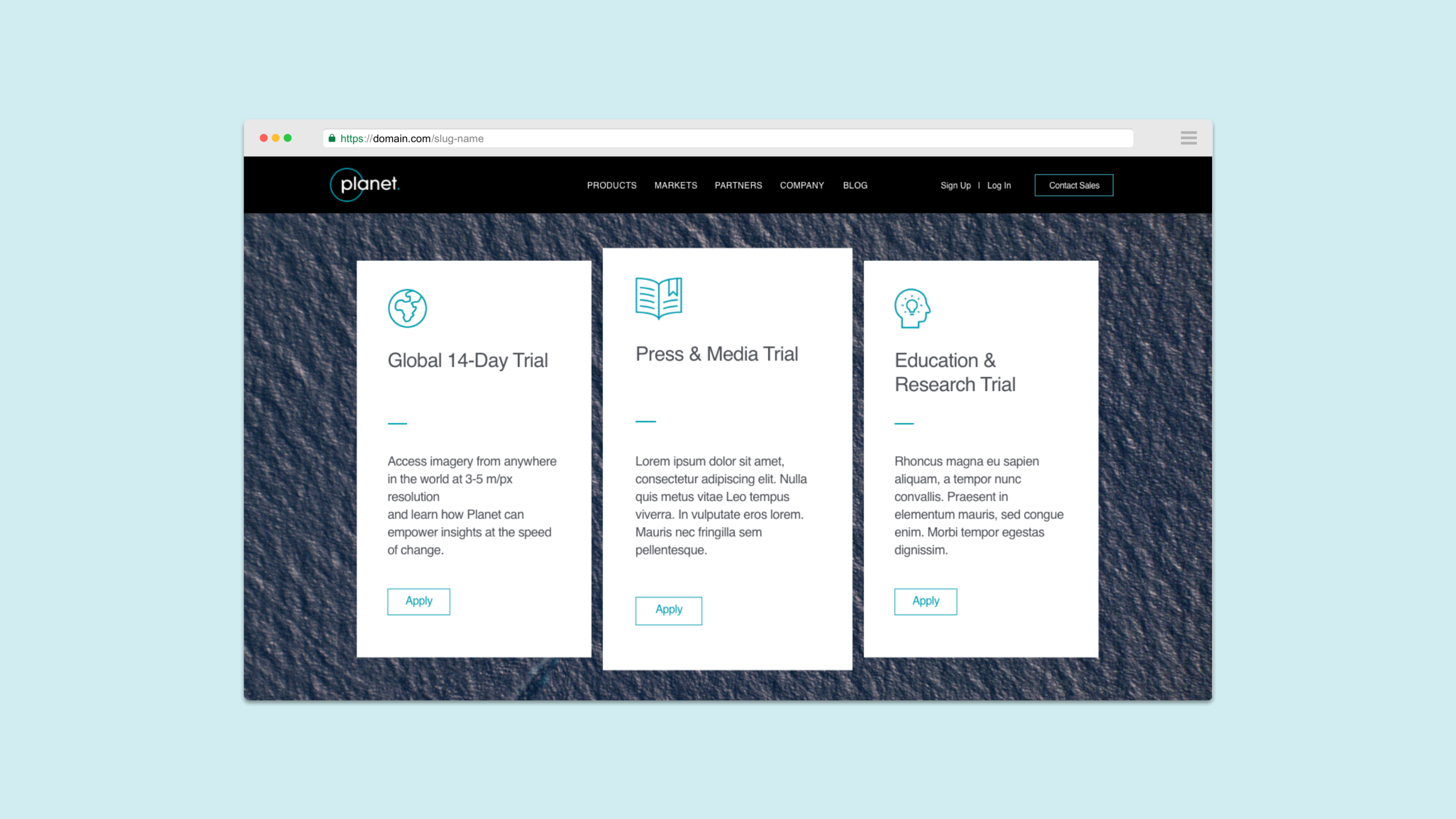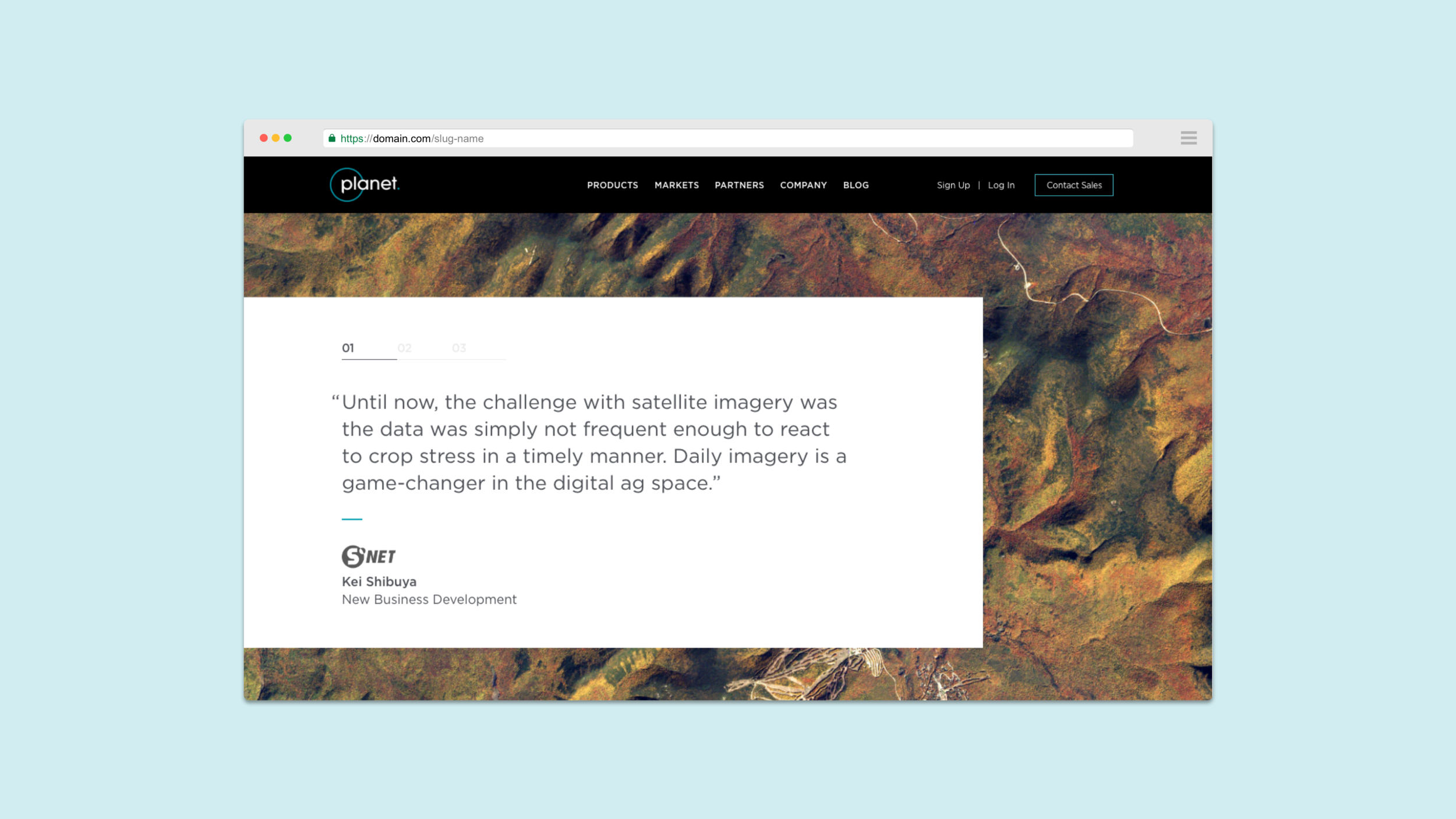 I tried giving the page a bit more of a “tech” look by utilizing elements like the see-through black card backgrounds, and the numbers on the slider indicators. Planet is a technology company after all and many of the markets they operate in are heavily technical. I also tried making more use of their extraordinarily beautiful satellite photography, introducing full screen image backgrounds wherever I could.
